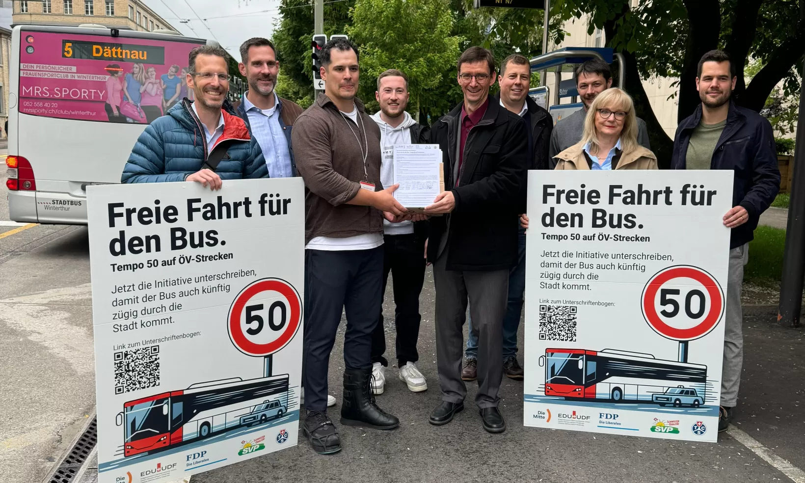 Am Montagnachmittag hat das überparteiliche Initiativkomitee der Stadtkanzlei die Initiative «Freie Fahrt für den Bus – Tempo 50 auf ÖV-Strecken» mit 1‘450 Unterschriften übergeben. Die Initiative verlangt, dass auf Staats- und Kommunalstrassen in der Stadt Winterthur, auf denen Busse des öffentlichen Verkehrs fahrplanmässig verkehren, in der Regel eine Höchstgeschwindigkeit von Tempo 50 gilt. Damit soll sichergestellt werden, dass Stadtbusse und Postautos weiterhin zügig vorankommen und so die Attraktivität des Winterthurer ÖVs erhalten bleibt.