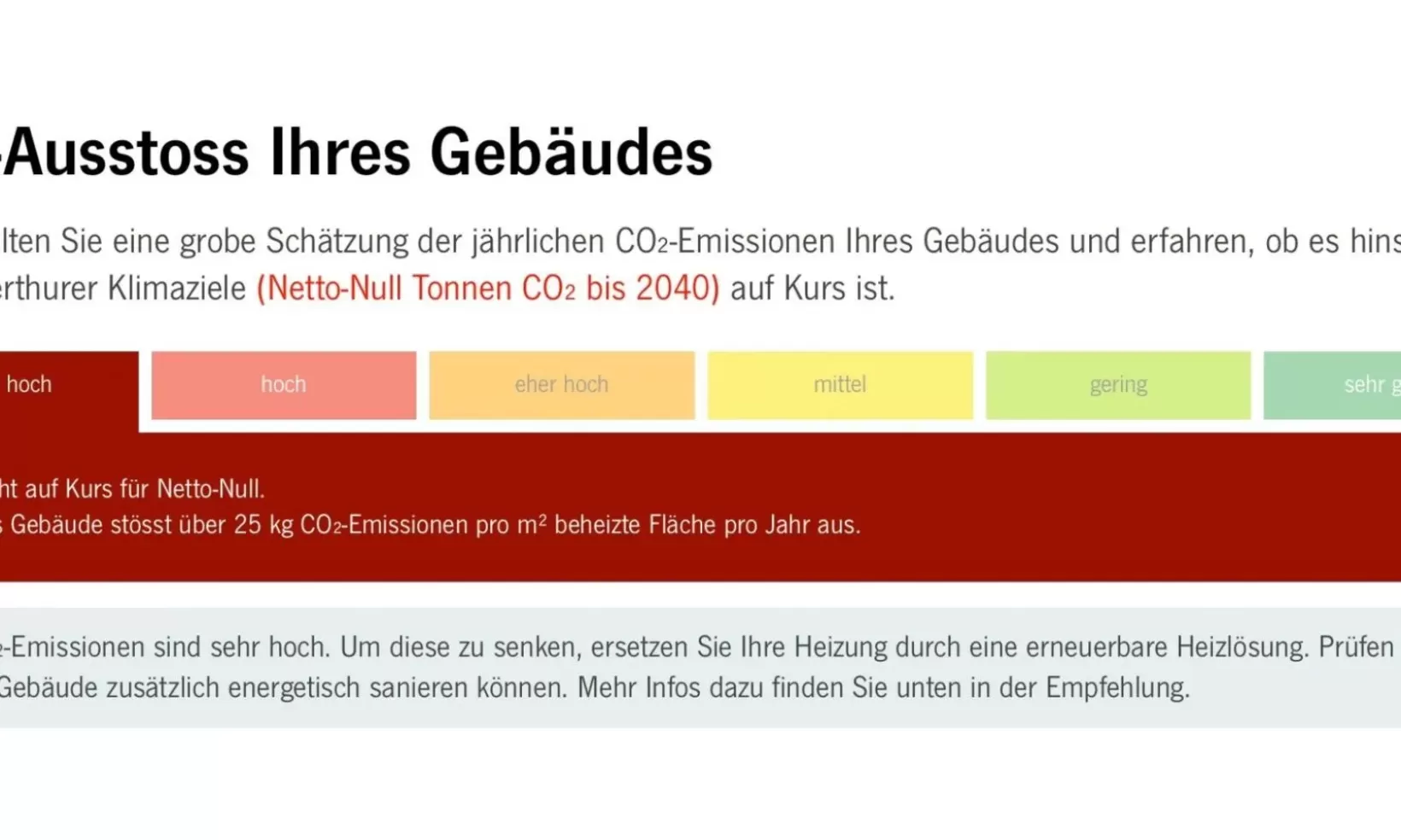 Im Energieportal der Stadt Winterthur wird aber ein CO2-Ausstoss von über 25 kg CO2-Emissionen pro m2 beheizte Fläche pro Jahr ausgewiesen, inklusive den Hinweisen «sehr hoch» und «Nicht auf Kurs für Netto-Null.» sowie roter Warnfarbe. Die Umrüstung der Heizung wurde damals von Stadtwerk realisiert und alle Änderungen der Stadt korrekt gemeldet.