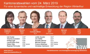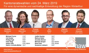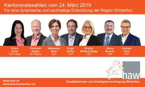 Die HAW unterstützt Kantonsratskandidatinnen und Kandidaten, die sich für eine dynamische und nachhaltige Entwicklung der Region Winterthur einsetzen. Die Evaluation hat anfangs November 2018 mittels eines Fragebogens stattgefunden, in welchem die Kandidatinnen und Kandidaten der CVP, FDP, SVP und GLP Ihre Antworten zu wichtigen Wirtschafts- und Entwicklungsthemen aus Stadt und Region Winterthur abgegeben haben.