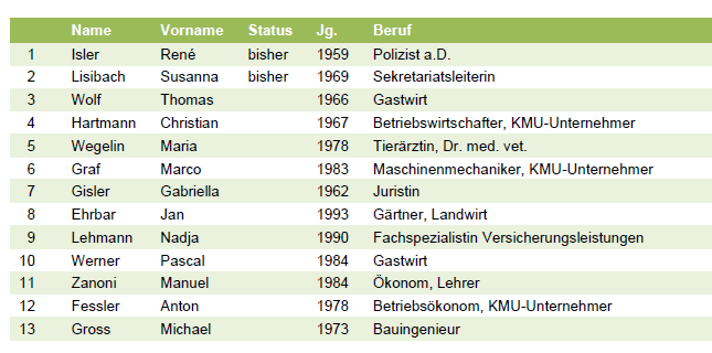 Die SVP will den 2019 verlorenen dritten Sitz zurückholen. Kantonsrat René Isler und Kantonsrätin Susanna Lisibach möchten ihre erfolgreiche Ratstätigkeit fortsetzen und kandidieren erneut. Mit den Stadtparlamentariern Thomas Wolf, Christian Hartmann und Maria Wegelin engagieren sich drei erfahrene Persönlichkeiten auf den Plätzen 3 bis 5 für einen zusätzlichen Kantonsratssitz.