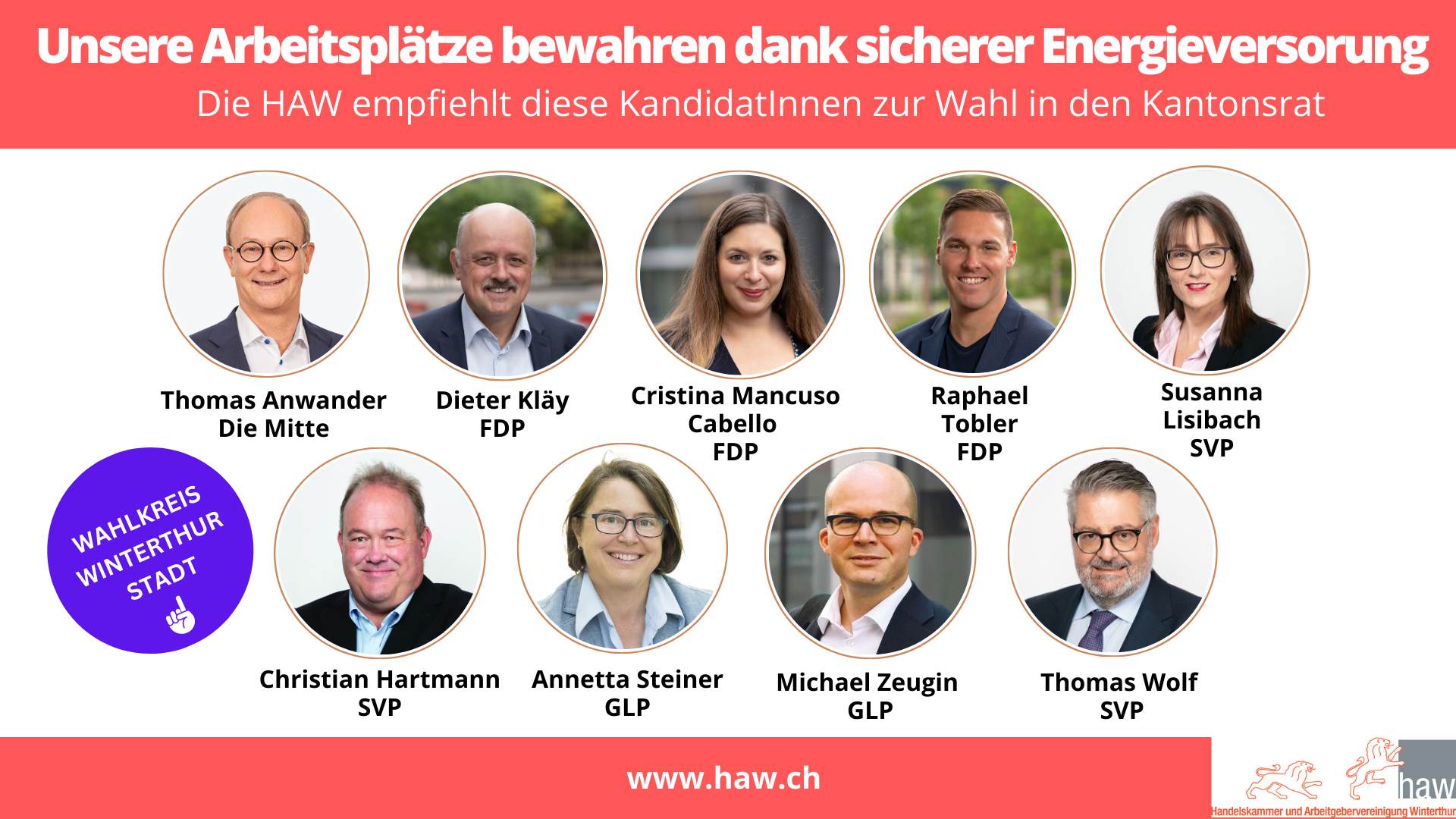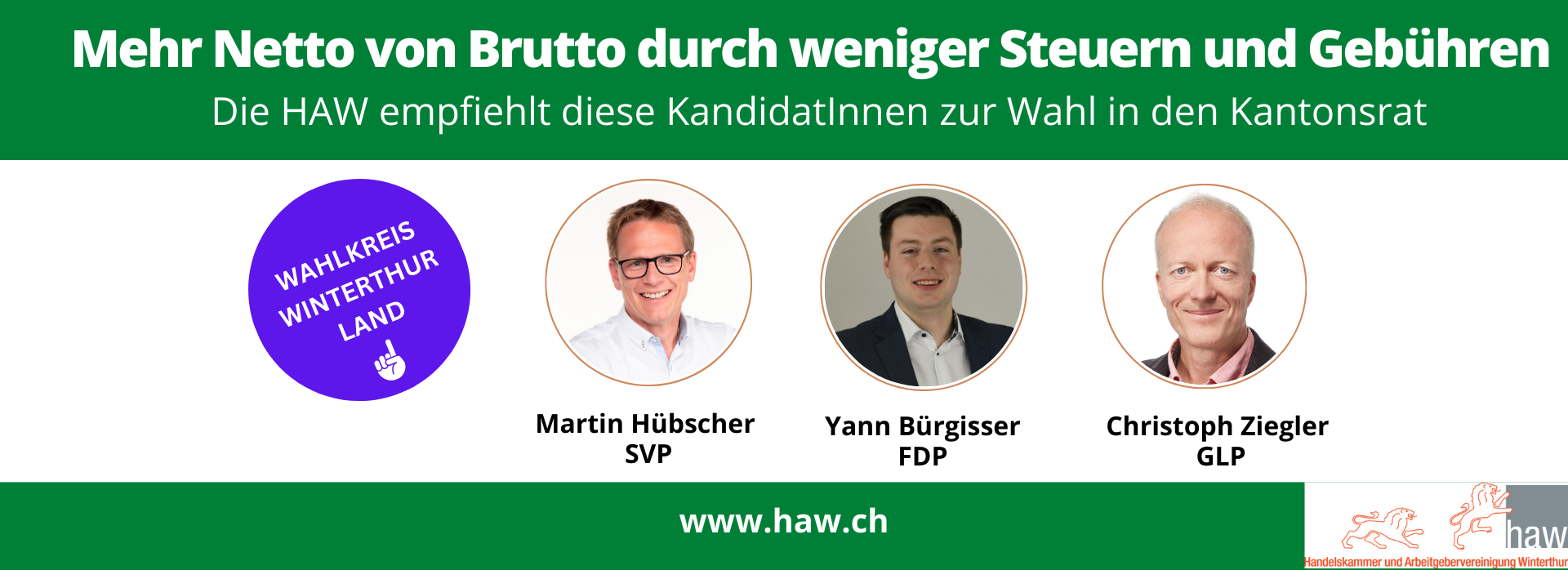 Der Kanton Zürich ist gefordert, seine Standort-Attraktivität zu halten. Gegeben die sich verschlechternde Wirtschaftslage haben wir uns zum Ziel gesetzt, KandidatInnen zu unterstützen, die einen Plan für die volkswirtschaftlichen Herausforderungen haben und sich für den Werkplatz einsetzen. Damit wir im Kanton Zürich nicht die gleichen Mehrheits-Verhältnisse wie in in den Stadtparlamenten von Zürich und Winterthur bekommen, empfiehlt die HAW die genannten Personen zur Wahl in den Kantonsrat und alle bürgerlichen KandidatInnen zur Wahl in den Regierungsrat. Es sind dies: