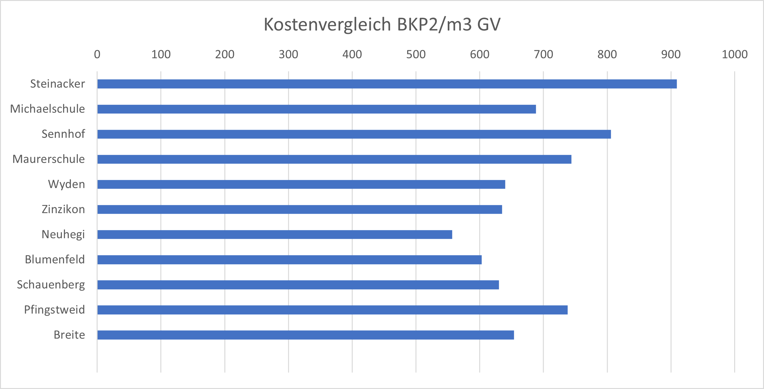 Die Gesamtkosten dafür basieren auf einer Grobkostenschätzung mit einer Kostengenauigkeit von +/- 25% und liegen in einer Grössenordnung von 40 - 68 Mio. Franken. Davon sind 18 - 30 Mio. Franken für den Neubau mit Räumen für 8 Klassen, schulergänzende Betreuung, 2 Kindergärten und Therapien vorgesehen. Zum Vergleich: Im Schulhaus Wallrüti bauen wir 47 Klassenzimmer plus Ergänzungsräume für 31 Mio. Franken. Deshalb haben wir aufgrund der Kommissionsdiskussion einen Kostenvergleich mit bestehenden Schulhäusern in Winterthur und im Kanton Zürich gefordert. Diesen haben wir erst nach nochmaligem Nachfassen kurz vor der Gemeinderatssitzung erhalten.