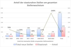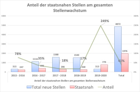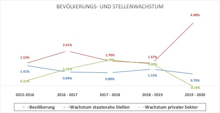 - Während das Bevölkerungswachstum in den Jahren 2015 bis 2020 um insgesamt +5.3% zunahm, war das Wachstum der staatsnahen Stellen mit 12.2% mehr als doppelt so hoch. Bei insgesamt 5844 neuen Einwohnern wurden zwischen 2015 und 2020 1976 neue staatsnahe Stellen geschaffen: 0.33 pro Bewohner/in.